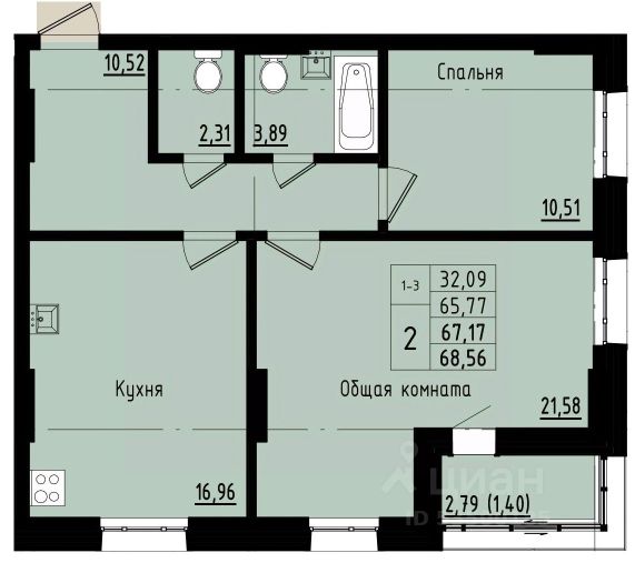 Двухкомнатная квартира евроформата • Прихожая 9,8 кв.м с нишей под гардеробную, где легко сложить вещи и не тратиться на покупку шкафов и комодов; • Просторная кухня-гостиная с 2-мя окнами и выходом на лоджию для общения и отдыха всей семьи; • Спальные комнаты, разнесенные по разным сторонам квартиры, рядом с которыми свой санузел; • Наличие двух санузлов обеспечит комфорт даже для большой семьи.