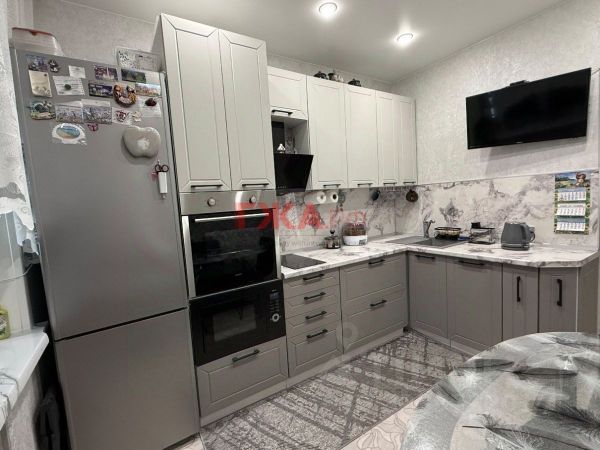 Хороший современный ремонт: везде натяжные потолки, встроенная кухня со встроенной техникой, встроенный шкаф-купе, в санузле кафель в потолок зашитые трубы, есть бойлер, сантехника новая, новые современные межкомнатная и входная двери (двери на санузел есть, но не установлен), счетчики все новые, в том числе счётчик на электроэнергию (перенесен в квартиру), полностью утепленный балкон, есть батарея, можно сделать холодным.