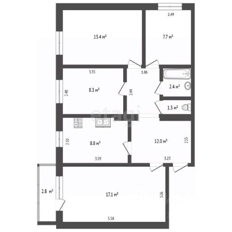 Две просторные спальни, кухня, зал - с видом во двор дома. Солнечная сторона! Совмещенный санузел.
