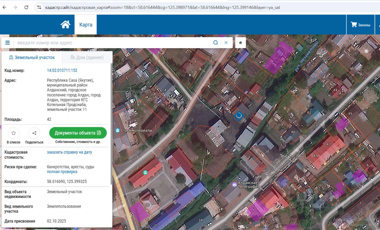 земельный участок, собственность которого не разграничена, площадью 42 кв. м., с кадастровым номером 14:02:010711:152, находящегося по адресу: Республика Саха (Якутия), Алданский район, г. Алдан, территория КГС Котельная Продснаба, земельный участок 11. Разрешенное использование: размещение гаражей для собственных нужд