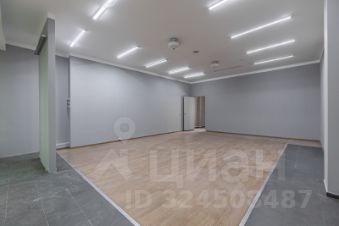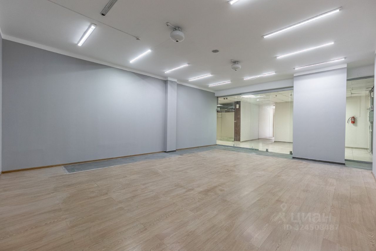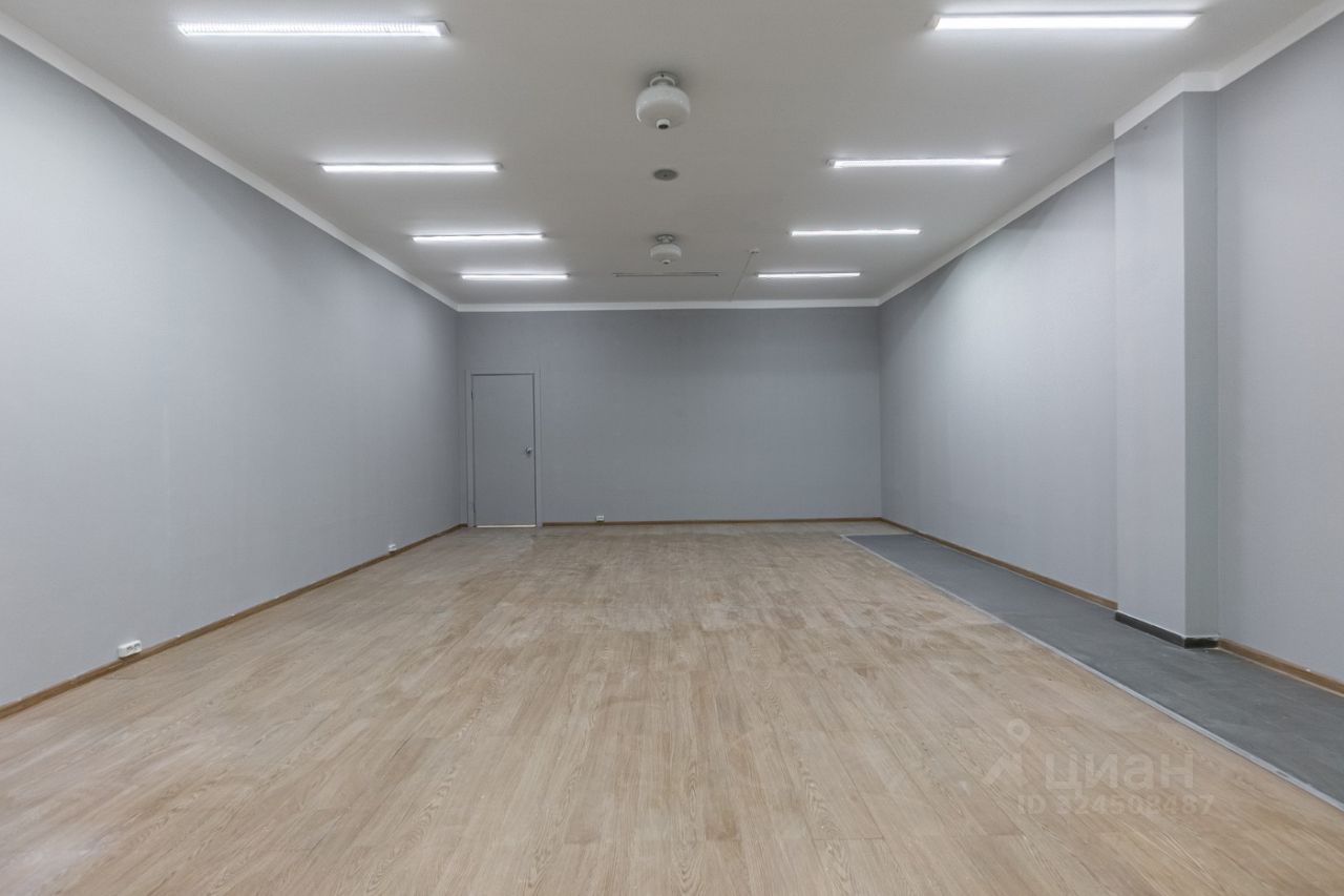 Помещение имеет свою кладовую комнату. Лицевая стена выполнена из витринного стекла на всю высоту потолка. Пол застелен керамогранитом и ламинатом, потолок имеет бетонное покрытие. Установлены диодные лампы. Потолок имеет бетонное покрытие. Высота потолка 3 м.