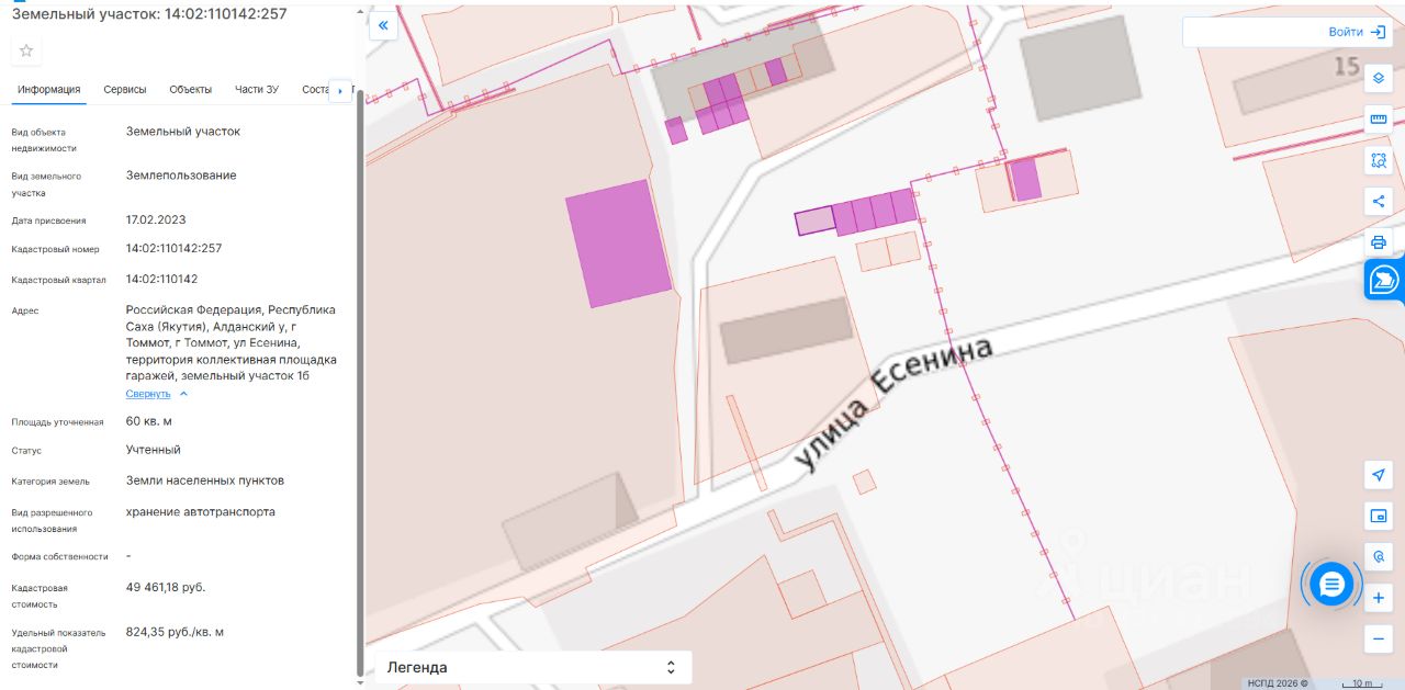 Земельный участок с кадастровым номером 14:02:110142:257 площадь 60 по адресу Российская Федерация, Республика Саха (Якутия), Алданский у, г Томмот, г Томмот, ул Есенина, территория коллективная площадка гаражей, земельный участок 1б