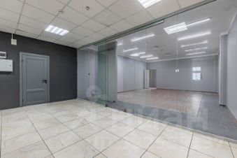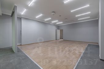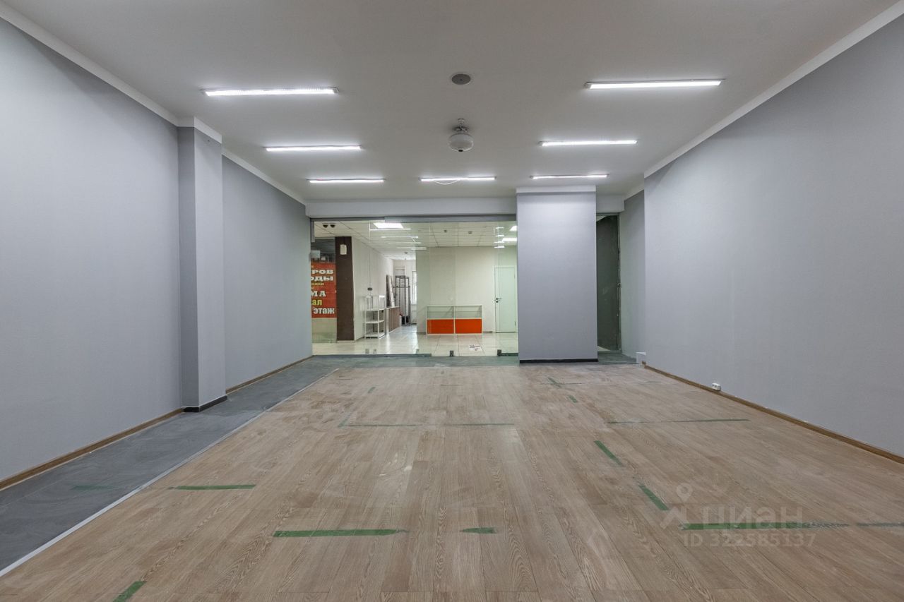 Помещение имеет свою кладовую комнату. Лицевая стена выполнена из витринного стекла на всю высоту потолка. Пол застелен керамогранитом и ламинатом, потолок имеет бетонное покрытие. Установлены диодные лампы. Потолок имеет бетонное покрытие. Высота потолка 3 м.
