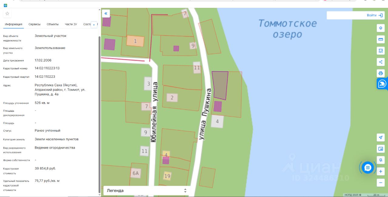 Земельный участок с кадастровым номером 14:02:110223:13 площадь 526 по адресу Республика Саха (Якутия), Алданский район, г. Томмот, ул. Пушкина, д. 4а