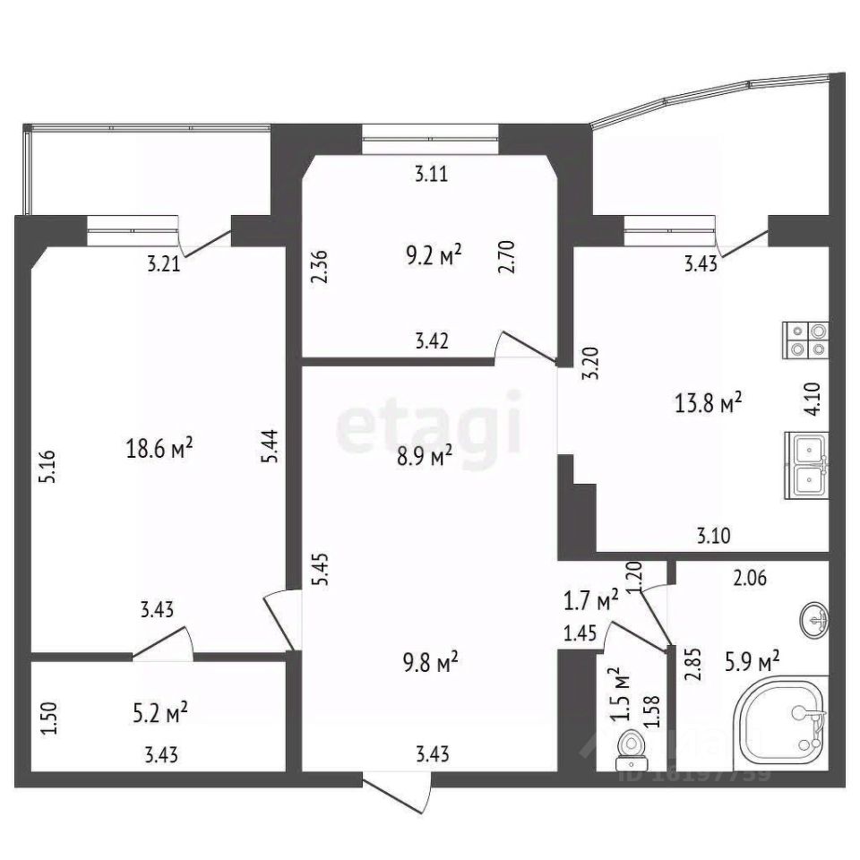 Спальню с гардеробной и балконом, вторую спальню, Гостиную, Кухню с выходом на балкон 5,2 м², Раздельный санузел