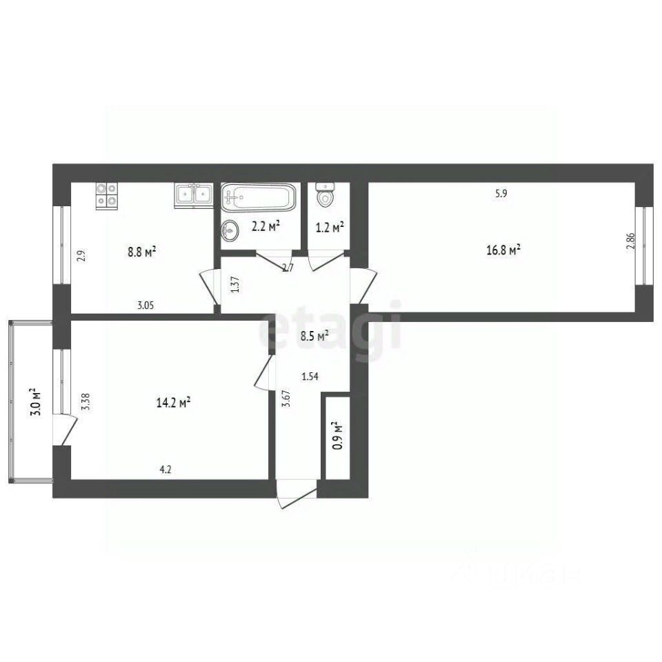 • Площадь: 52,6 кв.м. + просторный балкон.