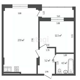 Общая площадь: 54,35 кв.м жилая - 49,9 кв.м. + лоджия в 4,45 кв.м