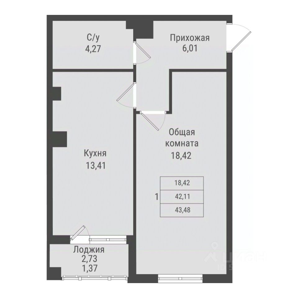 Общая площадь43,48 м²