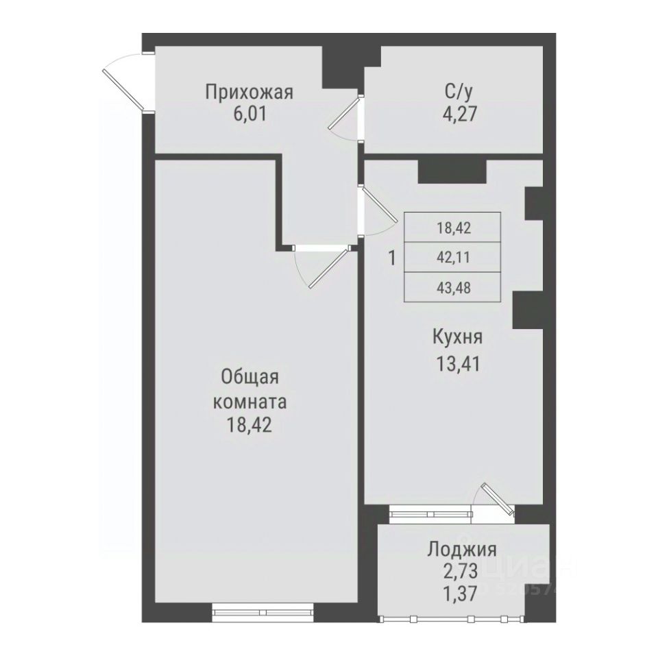 Общая площадь43,48 м²