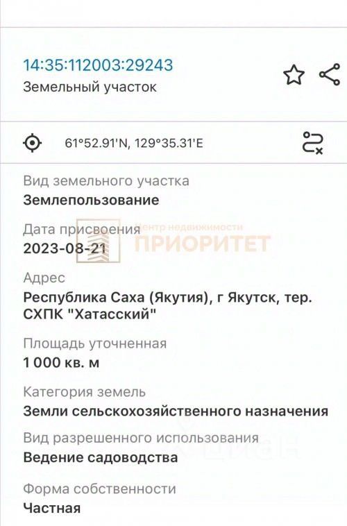 Продается участок СХПК Хатасский 14:35:112003:29243 1000 кв.м Правильной формы Цена 950 000 ВРИ Ведение садоводства